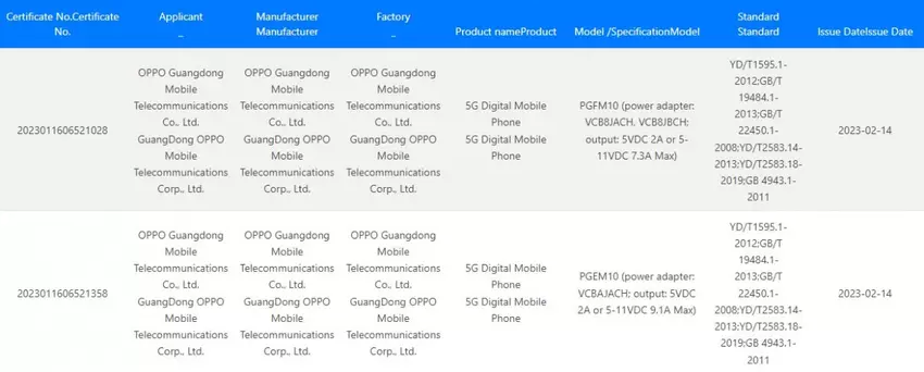 Certyfikacja ujawnia niektóre cechy nowych produktów. Tak więc bazowa wersja urządzenia występuje z numerem modelu PGFM110. Nowość pojawi się z 80W wsparciem szybkiego ładowania SuperVOOC (5V-11V/7,3A).