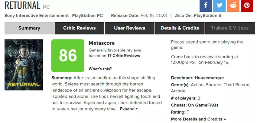 Krytycy bardzo chwalą Returnal na PC, dlatego na Metacritic gra otrzymała 86 punktów.