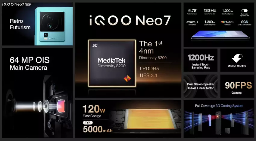 Nadchodzi iQOO Neo 7 z systemem Android 13 (powłoka Funtouch OS 13) i procesorem MediaTek Dimensity 8200. Układ sparowano z 8/12GB LPDDR5 RAM i 128/256GB pamięci masowej UFS 3.1. Nowość zasilana jest przez baterię o pojemności 5000 mAh. Obsługuje ona szybkie ładowanie o mocy 120W. Smartfon ma NFC, ekranowy skaner linii papilarnych, Bluetooth 5.3, Wi-Fi 6 i port ładowania USB-C.