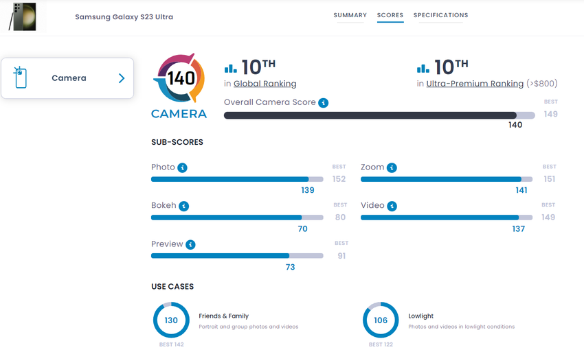 Galaxy S23 Ultra z łącznym wynikiem 140 punktów zajął 10. miejsce. Taki sam wynik uzyskały Google Pixel 7 i vivo X90 Pro+. Oprócz wspomnianych flagowców Honor Magic 4 Ultimate (147) i Huawei Mate 50 Pro (149), wyżej znalazły się Google Pixel 7 Pro (147), iPhone 14 Pro / Pro Max (po 146), Huawei P50 Pro (143), iPhone 13 Pro / Pro Max i Xiaomi Mi 11 Ultra (po 141).