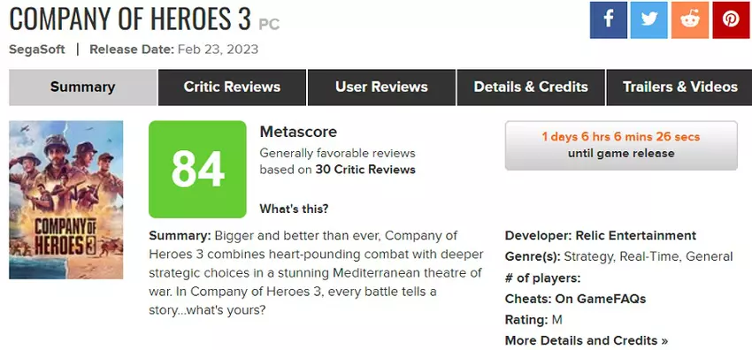 Krytycy byli zadowoleni z Company of Heroes 3. Gra otrzymała wysokie oceny na agregatorach