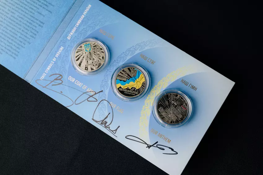 - 4 zestawy monet "Symbole Państwowe Ukrainy": "Nasz herb", "Nasza flaga", "Nasz hymn" z podpisami Prezydenta Wołodymyra Zelenskiego, Premiera Denisa Szmygala i Przewodniczącego Rady Najwyższej Rusłana Stefańczuka.