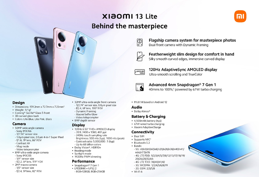 Xiaomi 13 Lite - Snapdragon 7 Gen 1, podwójna kamera przednia, wyświetlacz 120Hz i Android 12 od 499 euro.