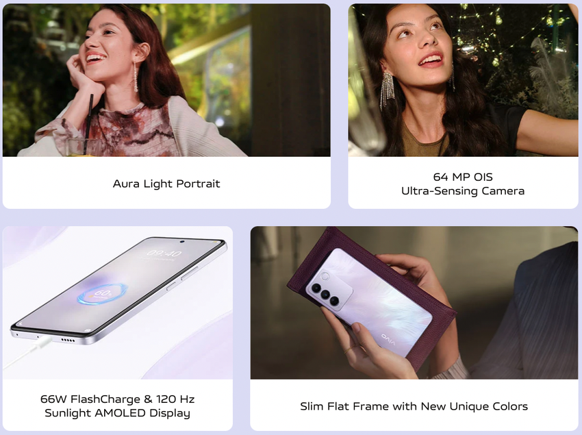 Nowy produkt został nazwany vivo V27e. Smartfon otrzymał 6,62-calowy wyświetlacz z matrycą AMOLED, rozdzielczością Full HD+ i częstotliwością odświeżania zwiększoną do 120 Hz. W górnej części ekranu umieszczono pojedynczy otwór na przednią kamerę o rozdzielczości 32 MP. Główny otrzymał trzy sensory. Główny sensor to 64 MP ze wsparciem OIS. Uzupełnia go moduł makro 2 MP oraz taki sam czujnik głębi.