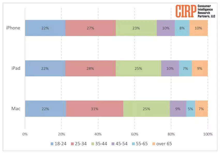 Firma CIRP, która specjalizuje się w badaniach rynku, postanowiła sprawdzić, w jakim wieku ludzie są najbardziej zainteresowani produktami Apple.