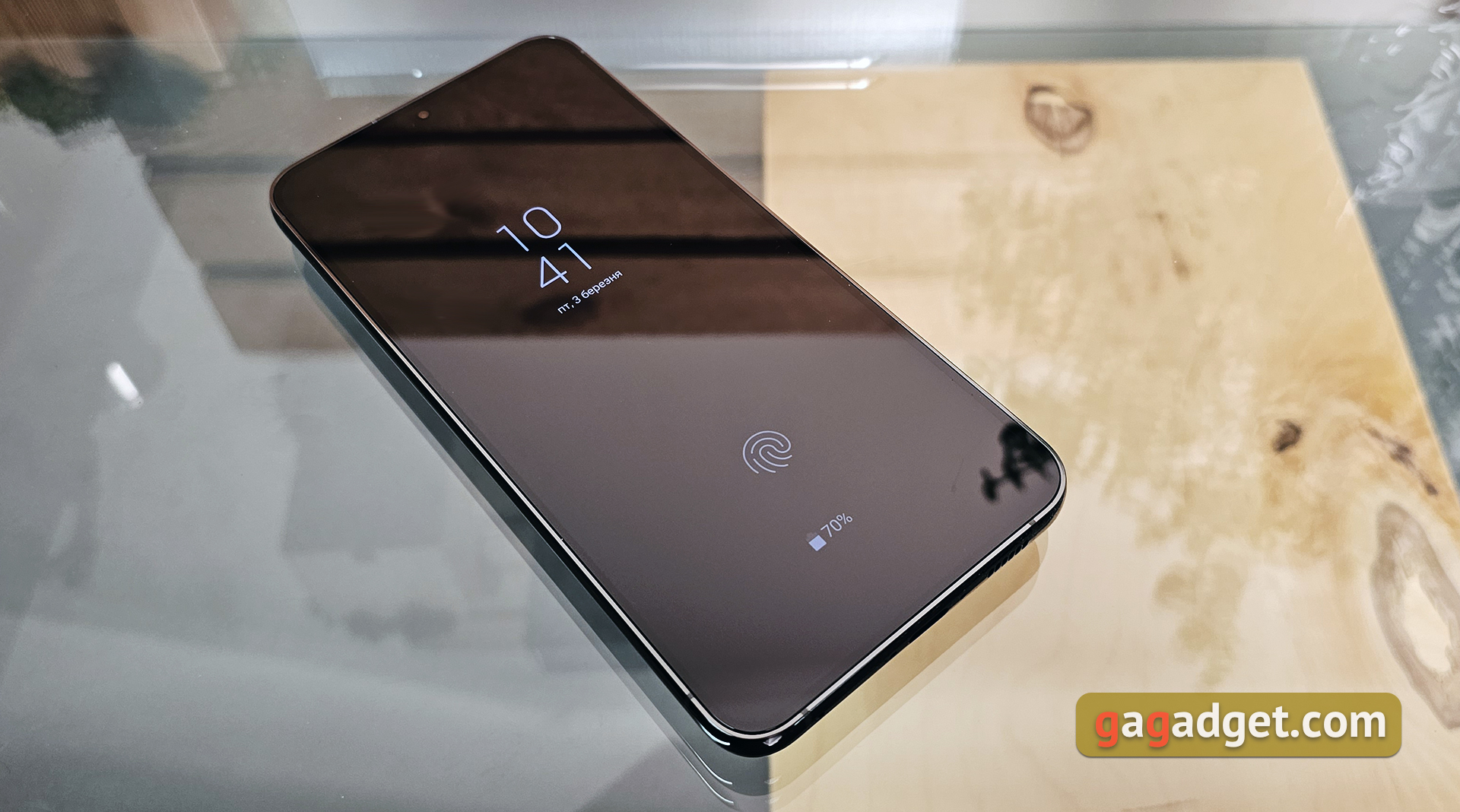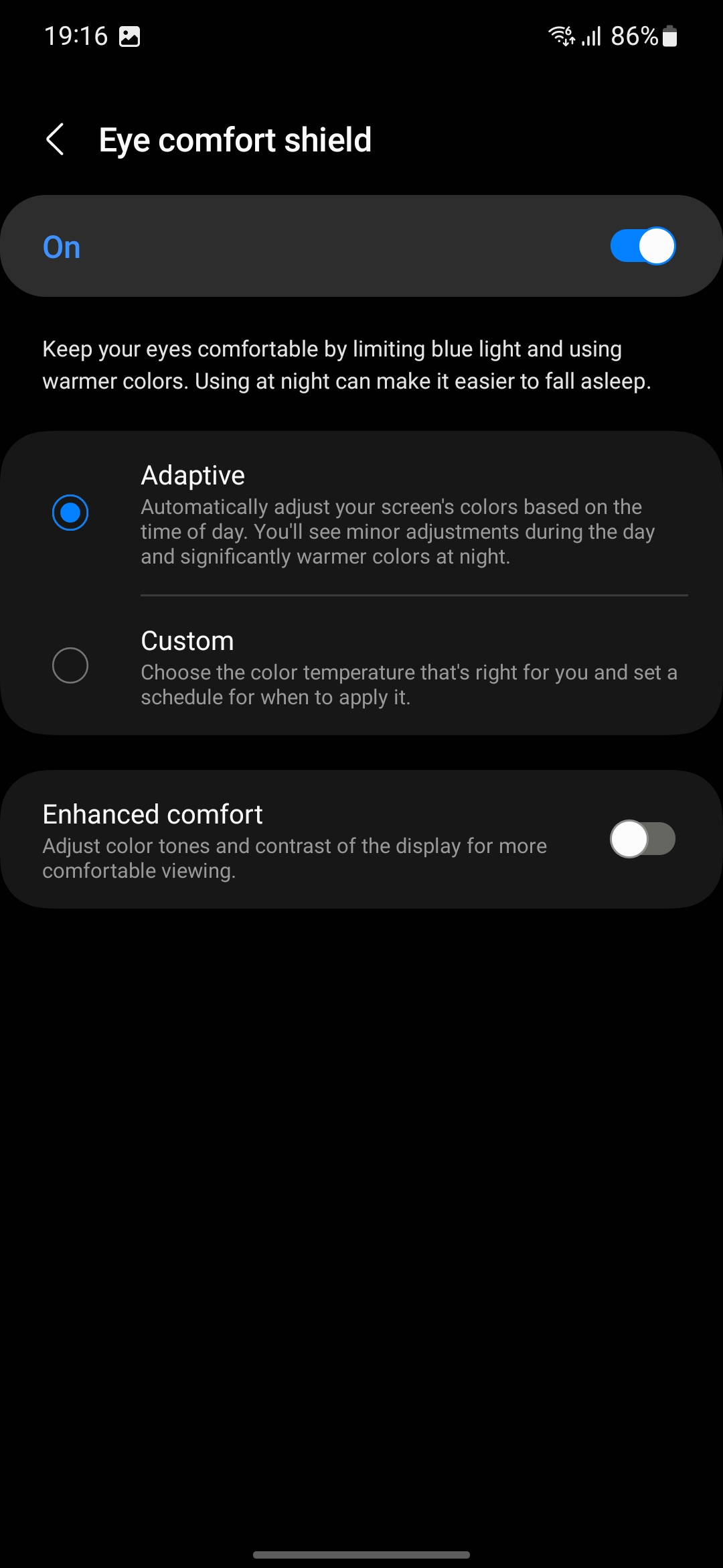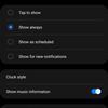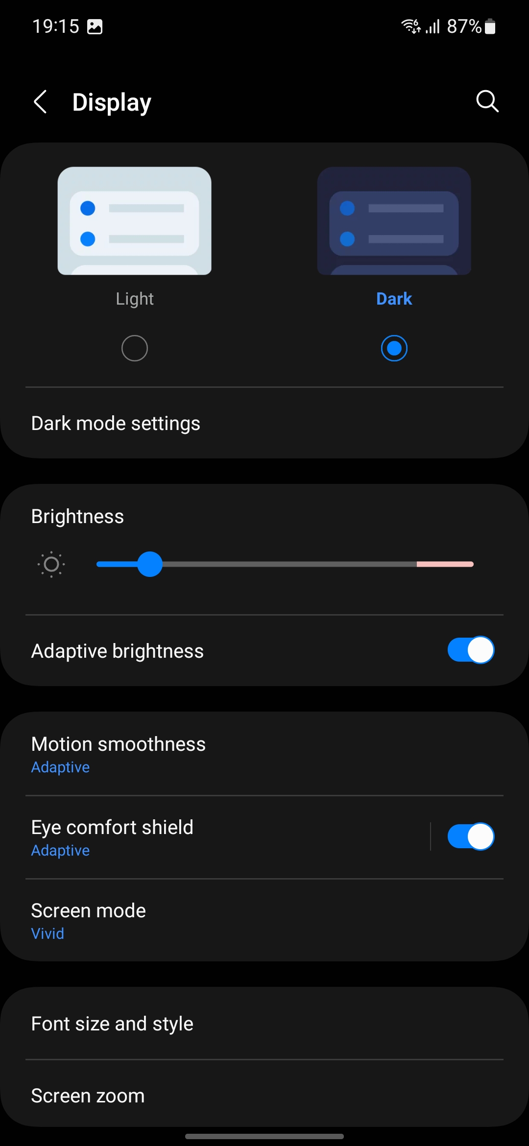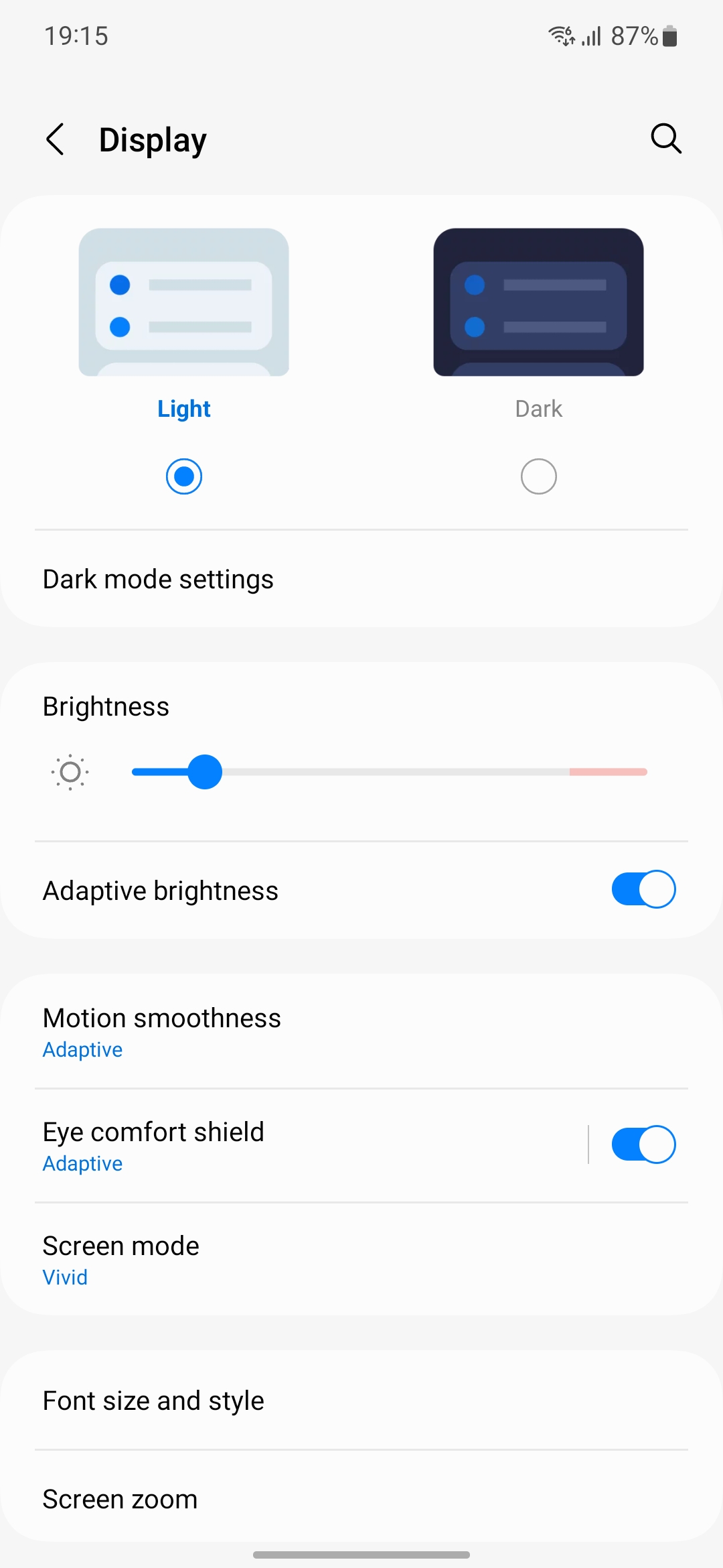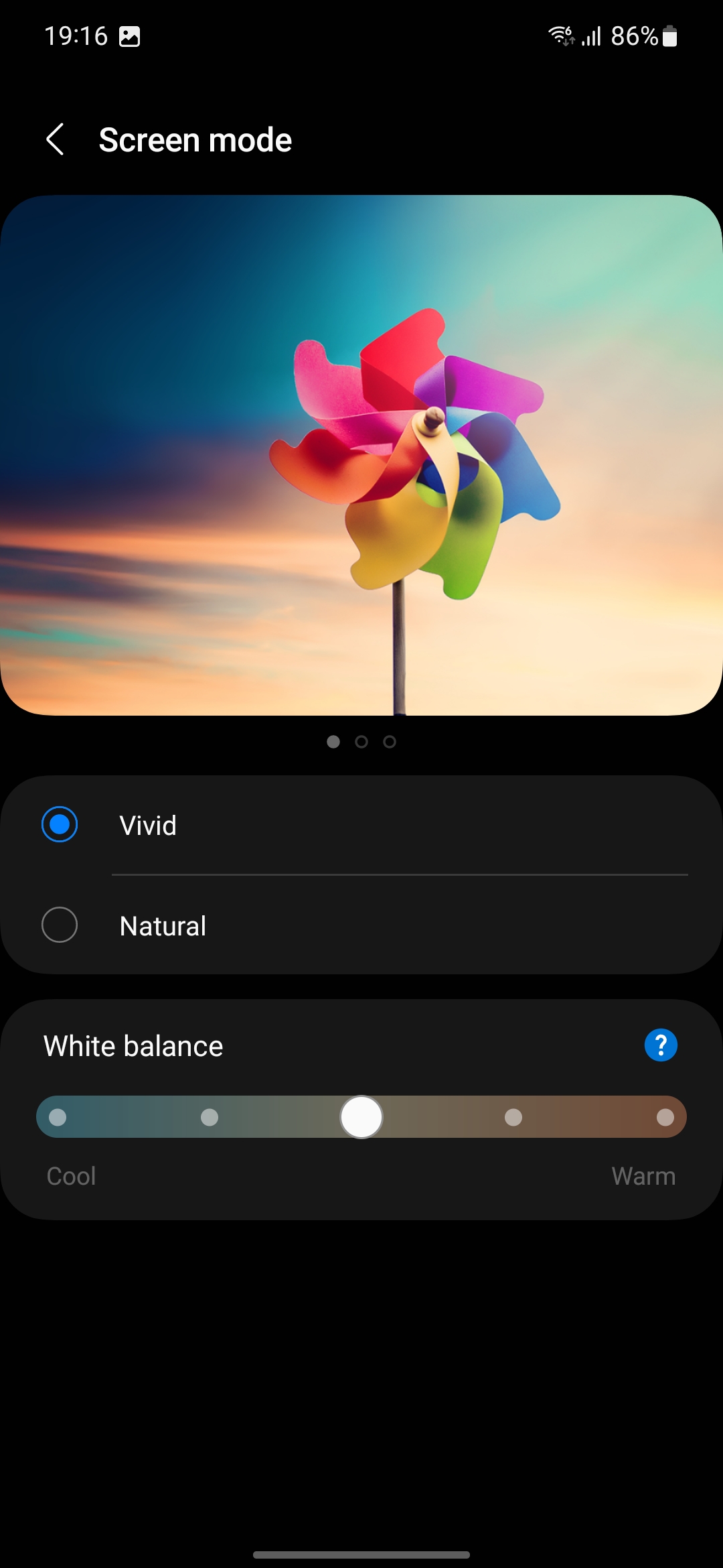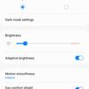 Zestaw ustawień jest podobny jak we wszystkich najnowszych flagowcach Samsunga: wybór jasnego lub ciemnego motywu z możliwością włączenia harmonogramu, jasność, skala elementów interfejsu, rozmiar czcionki, "komfort dla oczu" (automatyczne dostosowanie temperatury barwowej w zależności od oświetlenia otoczenia), tryby wyświetlania kolorów (bogaty i naturalny), częstotliwość aktualizacji i Always on Display: