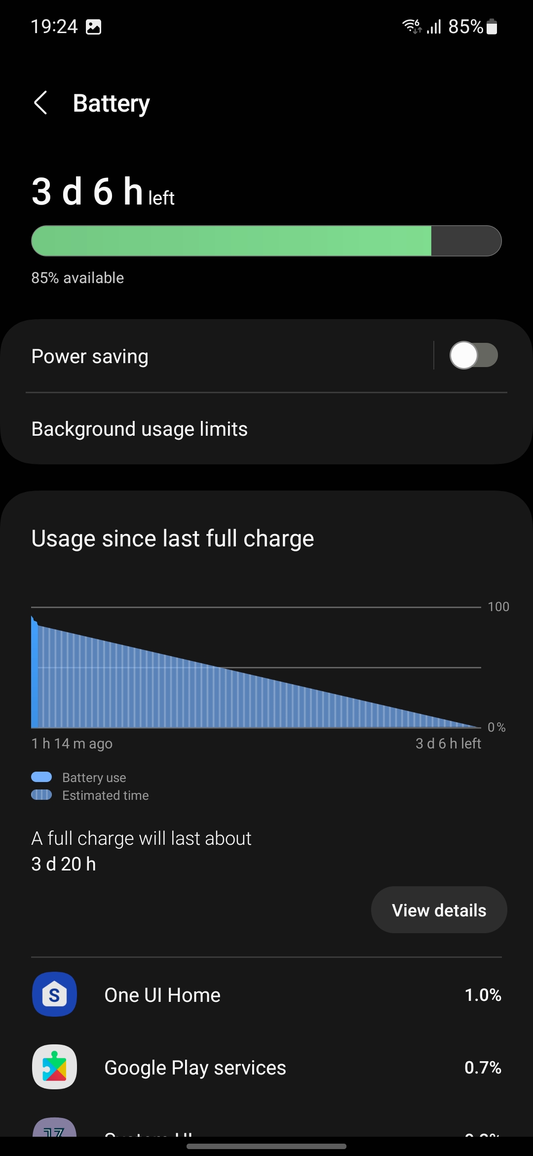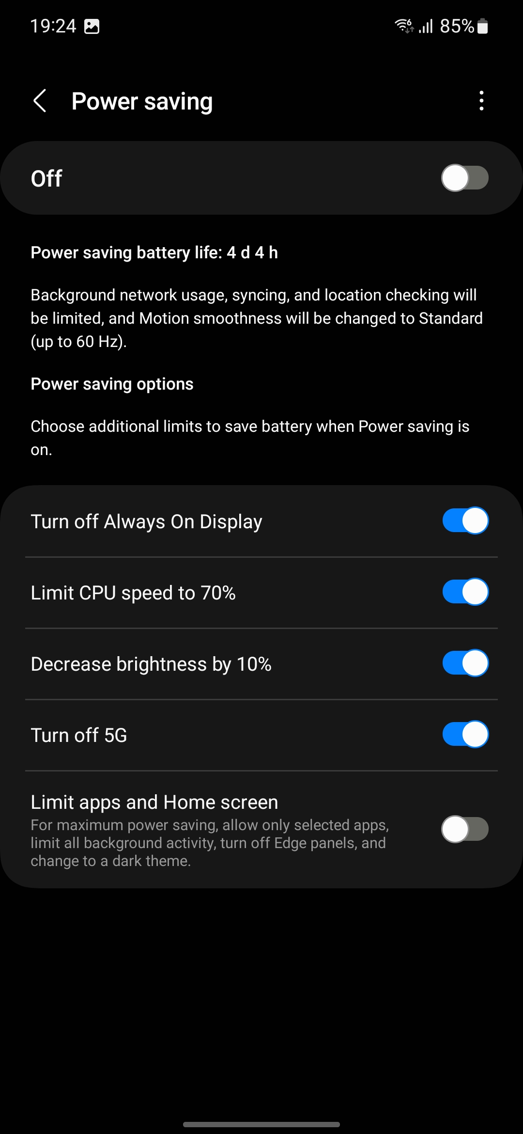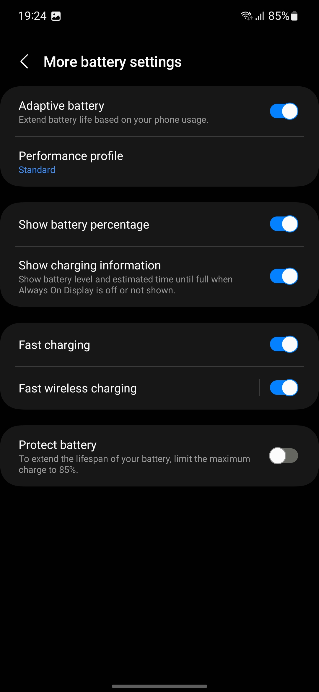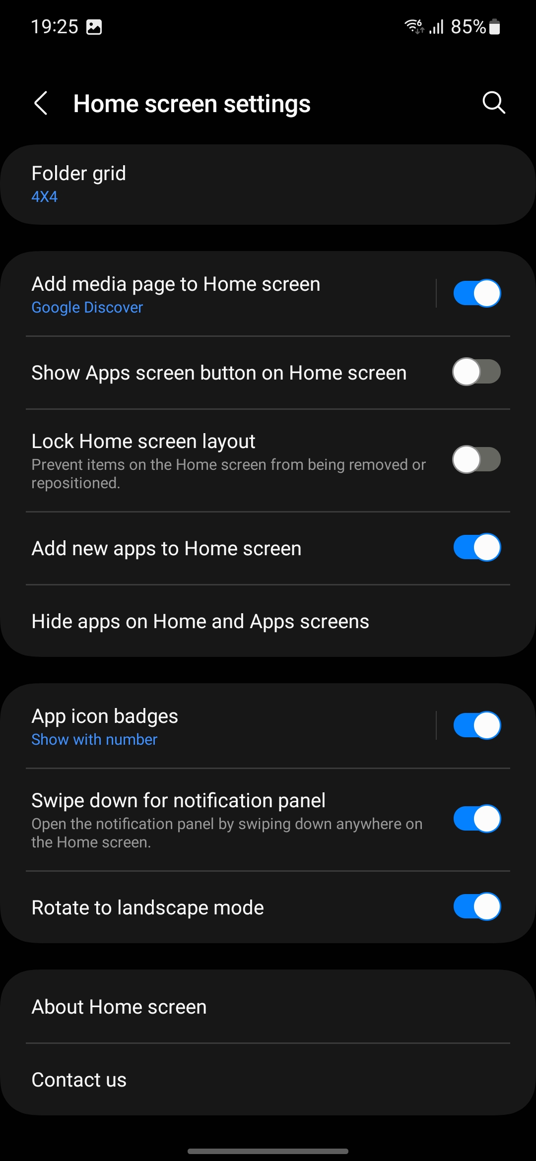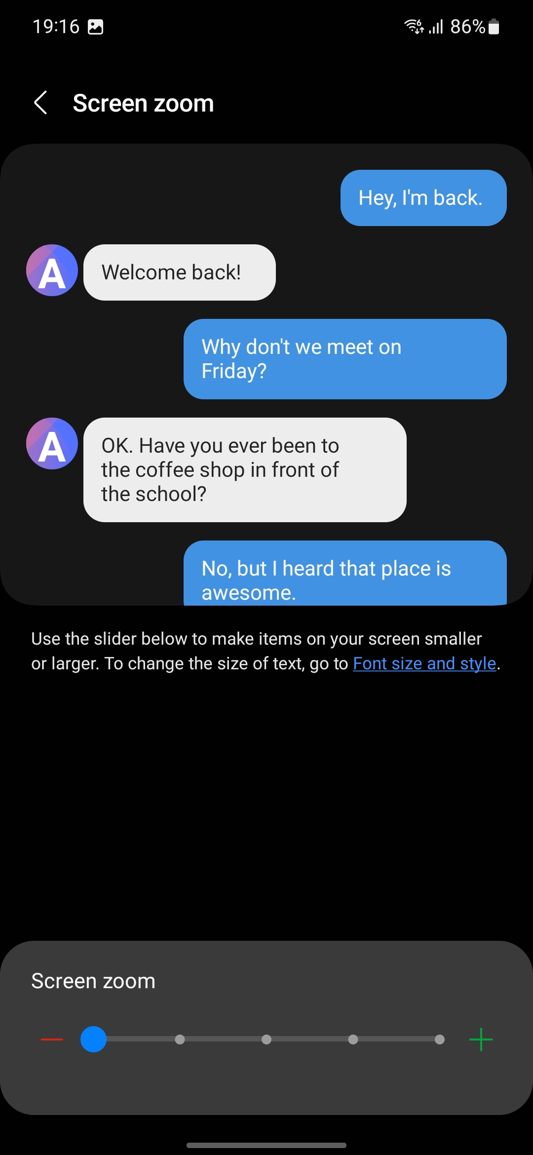Zestaw ustawień jest podobny jak we wszystkich najnowszych flagowcach Samsunga: wybór jasnego lub ciemnego motywu z możliwością włączenia harmonogramu, jasność, skala elementów interfejsu, rozmiar czcionki, "komfort dla oczu" (automatyczne dostosowanie temperatury barwowej w zależności od oświetlenia otoczenia), tryby wyświetlania kolorów (bogaty i naturalny), częstotliwość aktualizacji i Always on Display:
