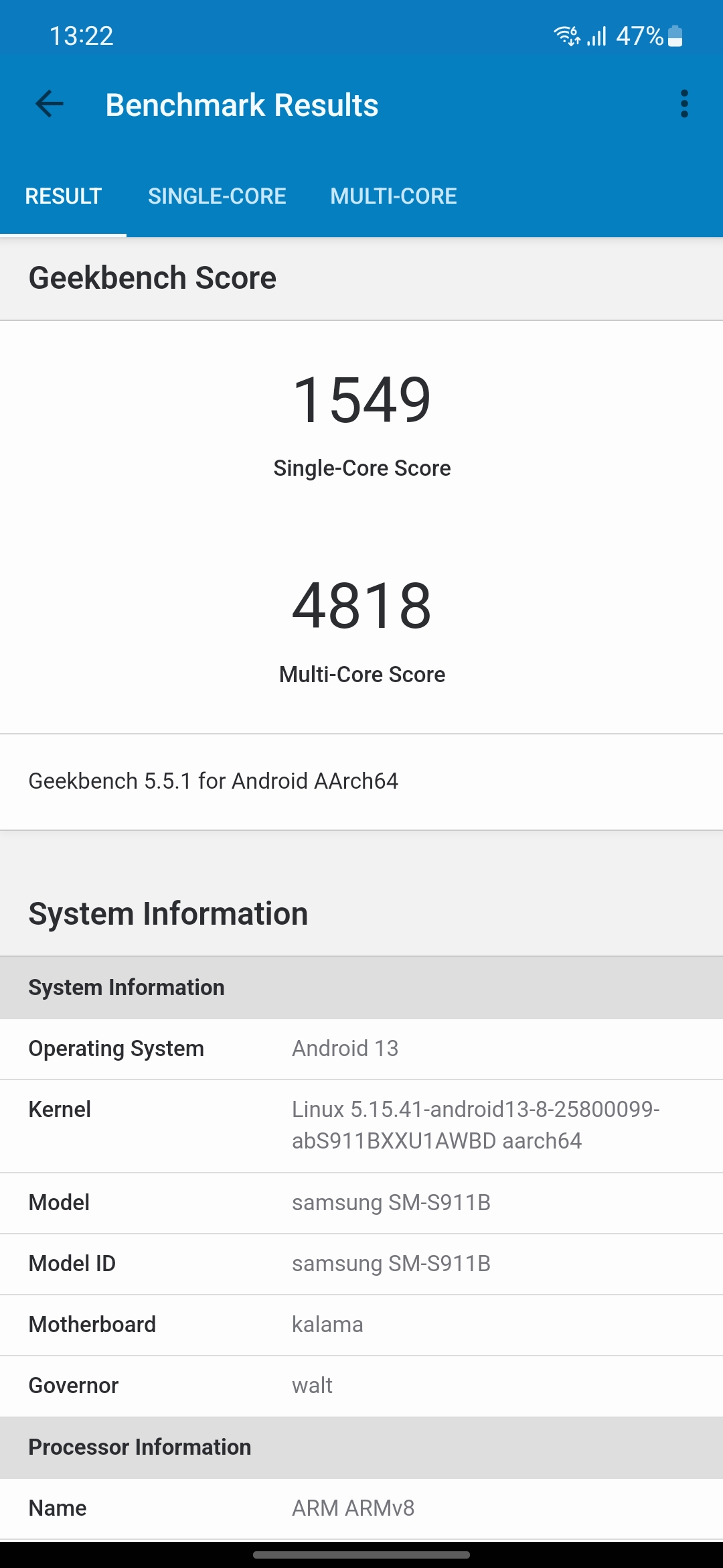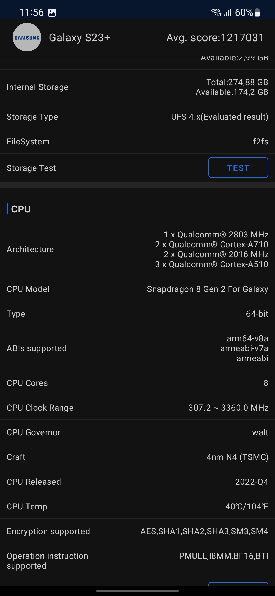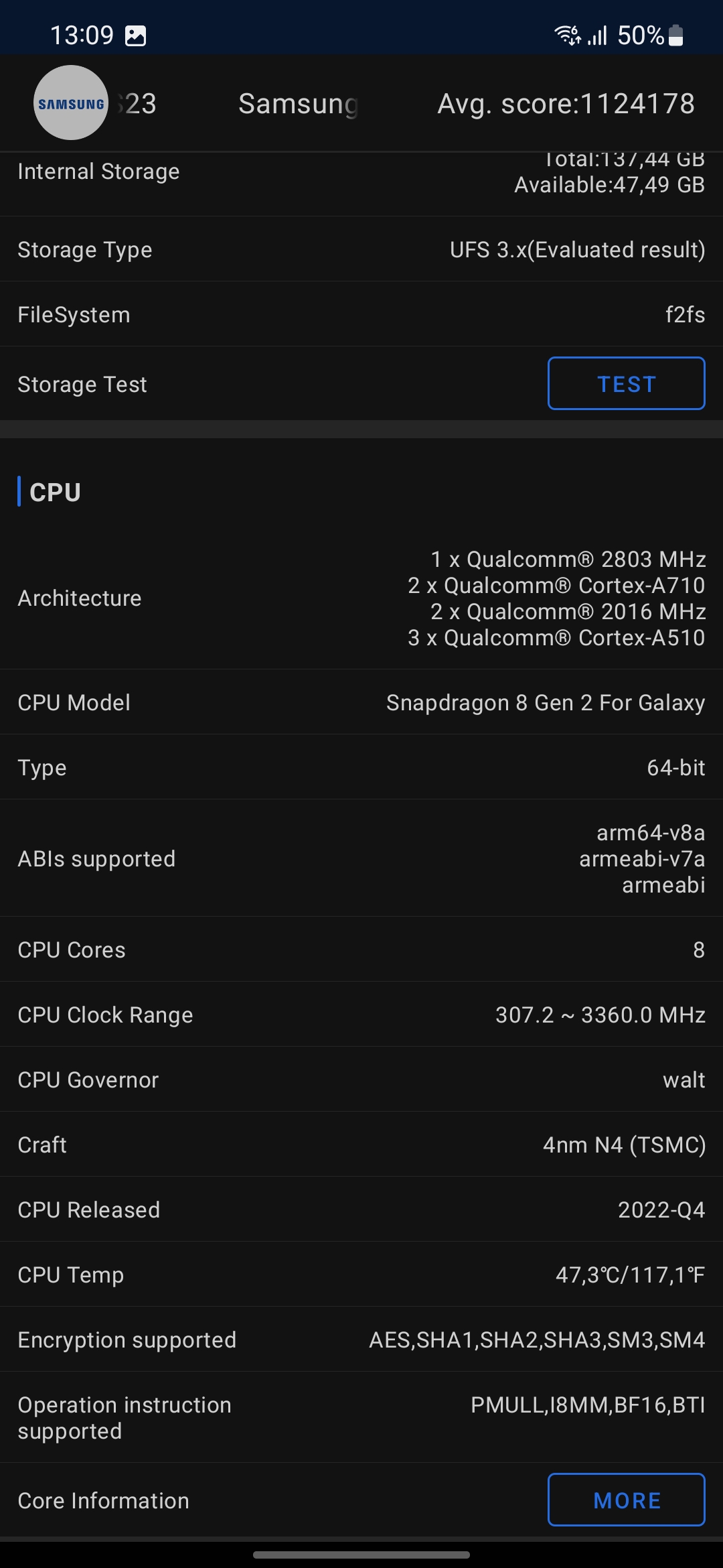 Flagowce Samsung Galaxy S23 i Galaxy S23+ otrzymały we wszystkich regionach flagowy procesor Qualcomm. Mianowicie Snapdragon 8 Gen 2 Mobile Platform for Galaxy, czyli nieco podkręconą wersję dla smartfonów Samsunga. Mówiliśmy już o nim w naszej recenzji Samsunga Galaxy S23 Ultra. Żeby nie przedłużać: to ośmiordzeniowy procesor wykorzystujący schemat 1+2+2+3 rdzenie, który jest wytwarzany w technologii 4nm procesu technologicznego. W jego skład wchodzi podkręcony do 3,36GHz rdzeń ARM Cortex-X3, dwa rdzenie Cortex-A715 o częstotliwości 2,8GHz, dwa rdzenie Cortex-A710 o częstotliwości 2,8GHz, trzy rdzenie Cortex-A510 o częstotliwości 2GHz oraz akcelerator graficzny Adreno 740 o częstotliwości 719MHz z obsługą ray tracingu w czasie rzeczywistym. Pamięć RAM może wynosić 8GB LPDDR5X. Pamięć wewnętrzna może wynosić 128/256GB dla Galaxy S23 i 256/512GB dla Galaxy S23+. Warto zwrócić uwagę na ważną kwestię. Wszystkie konfiguracje dostają najnowszą pamięć o prędkości UFS 4.0, z wyjątkiem Galaxy S23 o pojemności 128GB. W nim zastosowano UFS 3.1. Oba smartfony wykazują bardzo wysoką wydajność we wszystkich testach syntetycznych, a różnica między nimi jest minimalna. Zapas wydajności jest wystarczająco dobry na najbliższe kilka lat. Jedyne na co należy zwrócić uwagę to różnica w prędkości pomiędzy UFS 4.0 a UFS 3.1. Nowe pamięci wykazują prędkość odczytu na poziomie około 3350MB/s i zapisu około 1520MB/s. UFS 3.1 to odpowiednio 1725MB/s i 580MB/s. Testy wydajności Samsung Galaxy S23+: