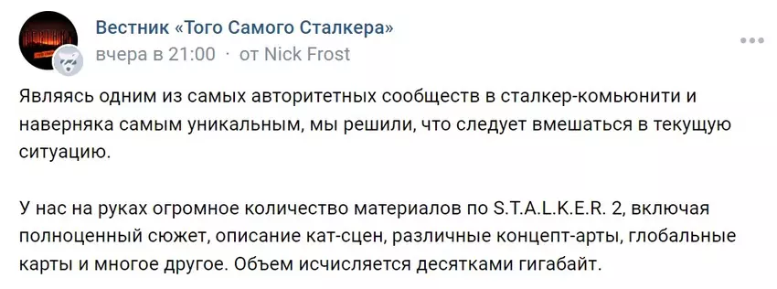 Na popularnym rosyjskim portalu społecznościowym, którego nazwy dla zasady nie wymieniamy, pojawił się absurdalny apel do twórców S.T.A.L.K.E.R. 2: Heart of Chornobyl, czyli jawny szantaż.