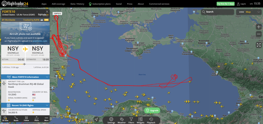 Dron leciał z bazy wojskowej Sigonella we Włoszech. Przeleciał przez Rumunię i skierował się w stronę Federacji Rosyjskiej. Będąc w odległości około 150 km od rosyjskiego miasta Soczi, dron wykonał kilka kółek nad Morzem Czarnym i wrócił do Rumunii, gdzie znajduje się w chwili pisania tego tekstu.