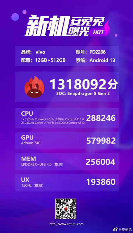 Test wydajności przeszła wersja z 12 GB pamięci RAM LPDDR5X i 512 GB pamięci masowej UFS 4.0. Baza danych AnTuTu podaje również, że smartfon posiada wyświetlacz 120Hz i działa pod kontrolą systemu operacyjnego Android 13.