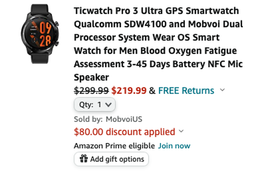 Mowa o modelu TicWatch Pro 3 Ultra GPS. Gadżet jest obecnie wyceniony na check price on amazon. Jednak z kuponem sprzedawcy zegarek jest w sprzedaży za 80 dolarów.