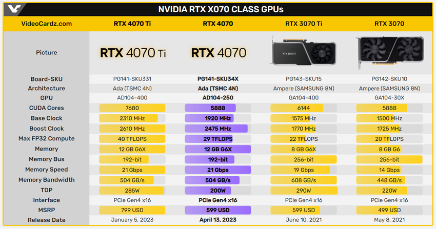 GeForce RTX 4070 będzie miał układ GPU AD104-250 z 5 888 procesorami strumieniowymi i taktowany od 1 920 MHz do 2 475 MHz. Wydajność będzie wynosić 29 TFLOPS.