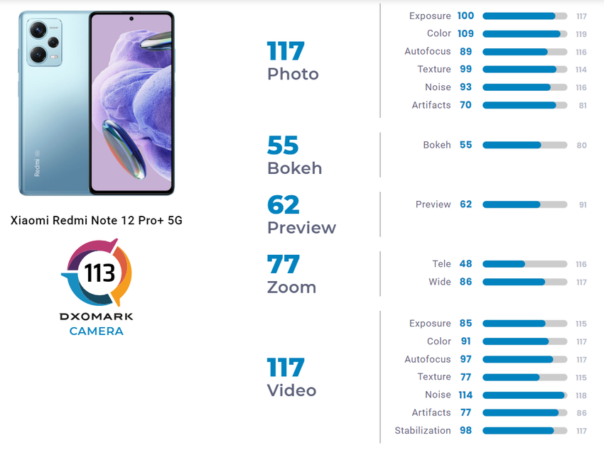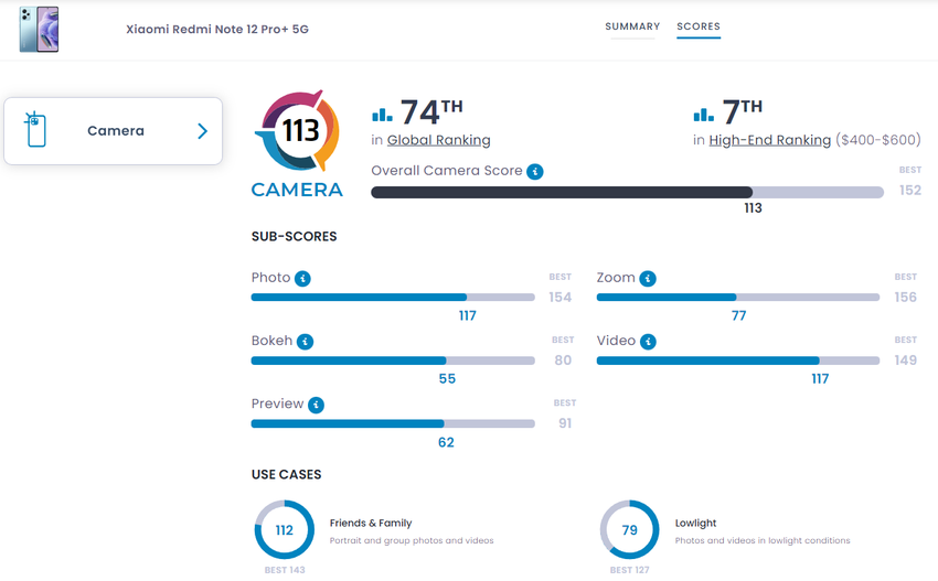 Możliwości wideo i fotograficzne Redmi Note 12 Pro+ 5G zostały ocenione na 117 punktów. Smartfon otrzymał 77 punktów za fotografowanie z zoomem, mimo że model ten nie posiada teleobiektywu. Z łącznym wynikiem 113 punktów nasz bohater znalazł się na 74. pozycji.
