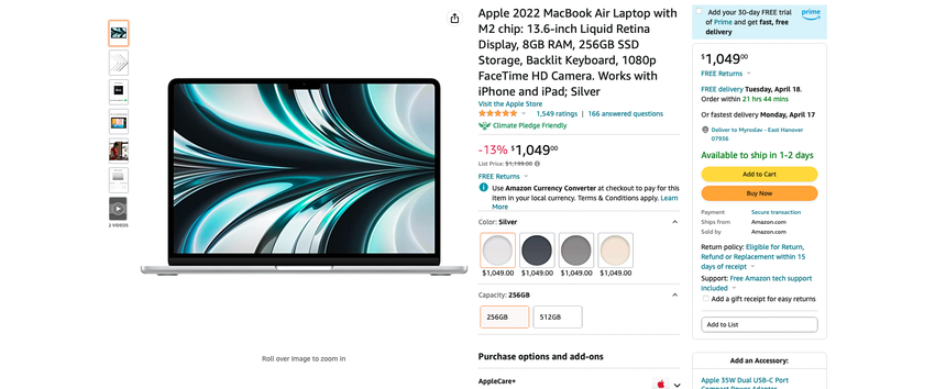 Laptop sprzedawany jest na Amazonie w czterech kolorach i dwóch wersjach pamięciowych: