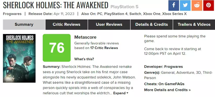 Monotonne i nudne: krytycy umiarkowanie ocenili remake Sherlock Holmes: The Awakened. Gra otrzymała średnią ocenę na agregatorach