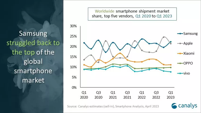 W pierwszym kwartale 2023 roku prym wiódł Samsung. W raportowanym okresie udział południowokoreańskiego producenta wyniósł 22%, czyli o 2% mniej niż rok temu. Warto jednak zauważyć, że w porównaniu z końcem 2022 roku Samsung był w stanie zwiększyć sprzedaż i prześcignąć Apple.