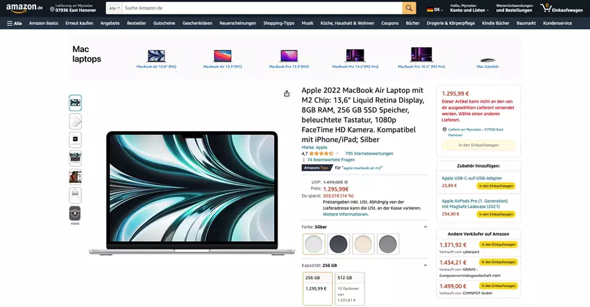 MacBook Air z układem M2 i pamięcią masową 256 GB w sprzedaży na Amazon z rabatem 203 euro