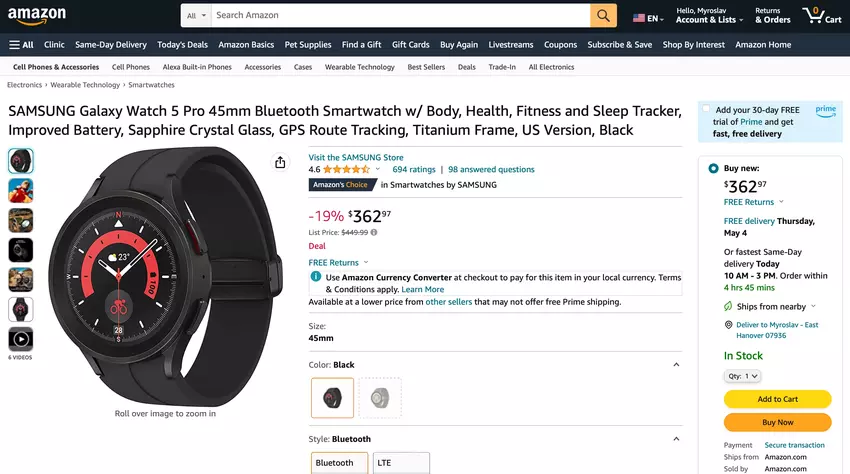 Smartwatch Samsung Galaxy Watch 5 Pro jest w sprzedaży na Amazonie z rabatem 87 dolarów