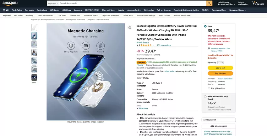 Mówimy o białym power banku firmy Baseus. Jest on obecnie w sprzedaży za check price on amazon. Ale z kuponem sprzedawcy można go kupić jeszcze taniej.