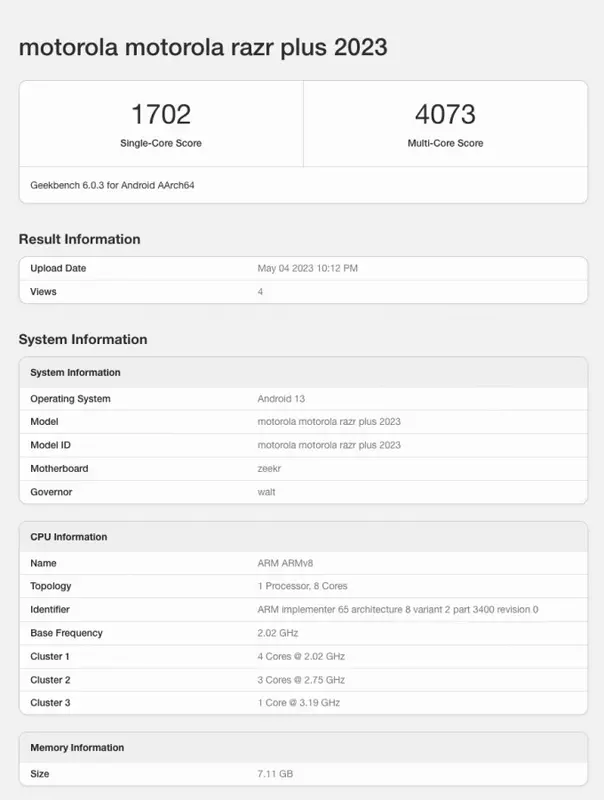 Motorola Razr+ 2023 uzyskała wynik 1702 i 4073 w testach Single-Core i Multi-Core odpowiednio. Test wydajności przeszła modyfikacja wyposażona w 8 GB pamięci RAM.