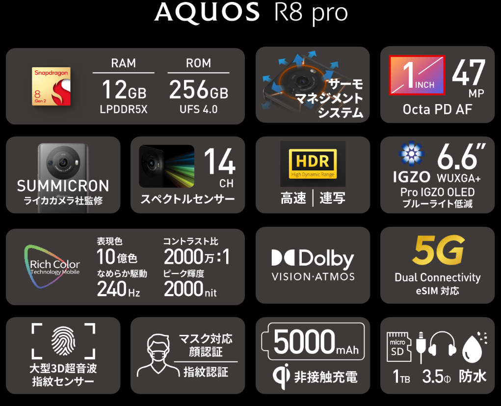 Sharp Aquos R8 Pro wyposażony jest w przednią kamerę 12,6 MP, Wi-Fi 6, Bluetooth 5.3, NFC, gniazdo słuchawkowe oraz ultradźwiękowy skaner linii papilarnych Qualcomm 3D Sonic Max. Pojemność baterii wynosi 5000mAh. Smartfon posiada wsparcie dla bezprzewodowego ładowania Qi. Wodoszczelność obudowy jest zgodna z normą IP68.