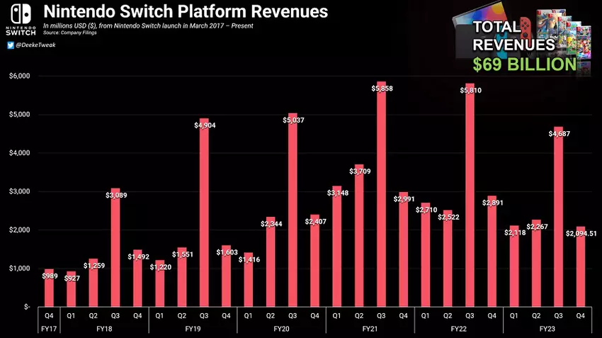 Analitycy z TweakTown.com jasno pokazali, że przychody firmy ze sprzedaży urządzeń i gier przekroczyły 69 miliardów dolarów od premiery pierwszych konsol Nintendo Switch w marcu 2017 roku!