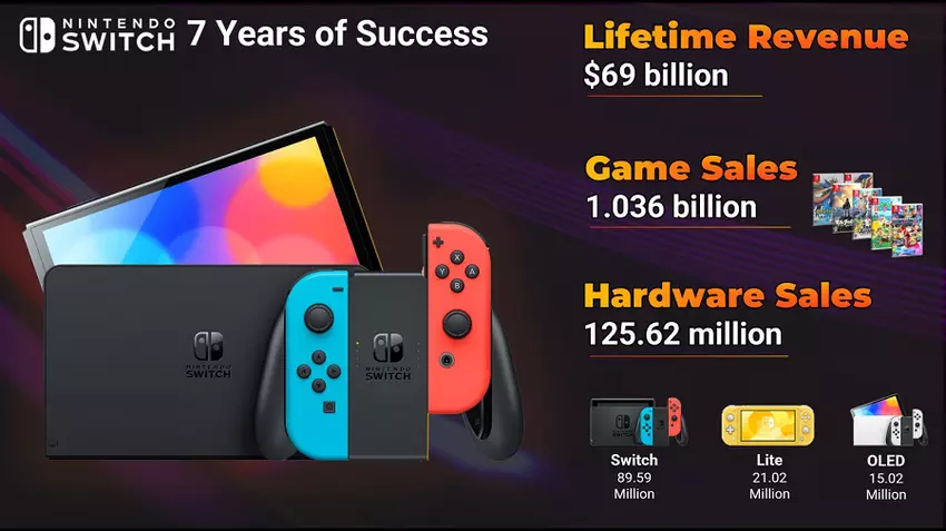 - W ciągu siedmiu lat sprzedano 125 milionów urządzeń. Blisko 90 milionów z nich to wersja standardowa, 21,02 miliona to jednostki Nintendo Switch Lite, a model z ekranem OLED sprzedał się w liczbie ponad 15 milionów sztuk;
