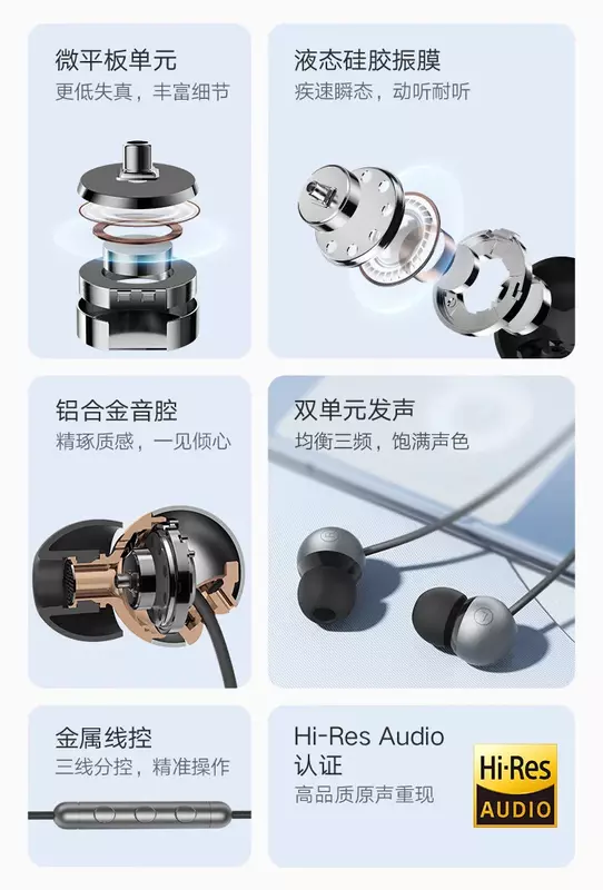 Nowość może pochwalić się certyfikatem Hi-Res Audio, a także płynną silikonową mikromembraną, która wychwytuje szczegóły dźwięku w bardzo szerokim zakresie częstotliwości. Słuchawki wykonane są ze stopu aluminium. W zestawie znajduje się pilot zdalnego sterowania i kabel o długości 128 cm. Urządzenie waży 14,7 grama. Xiaomi Dual Magnetic Ultra Dynamic Unit ma moc wyjściową 5 mW i działa z częstotliwością od 20 Hz do 20 kHz.