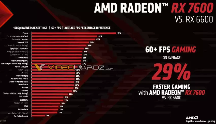 Według producenta, nowość przewyższa model Radeon RX 6600 średnio o około 29% podczas grania w gry na maksymalnych ustawieniach graficznych w rozdzielczości Full HD. AMD twierdzi również, że Radeon RX 7600 w rozdzielczości Full HD jest w stanie zapewnić 60 FPS nawet w dzisiejszych grach.