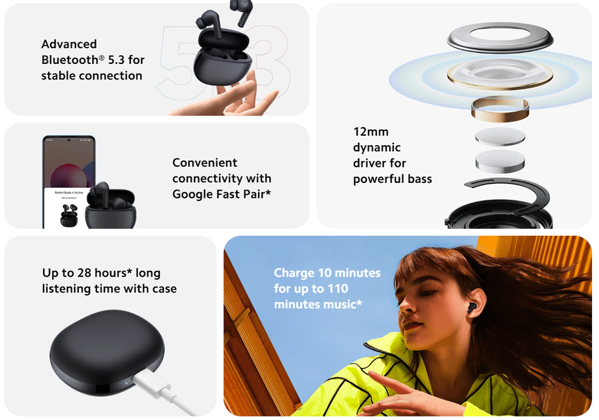 Redmi Buds 4 Active mogą wytrzymać do 5 godzin w trybie słuchania muzyki. Etui ładujące z baterią 440 mAh wydłuża czas pracy do 28 godzin. Słuchawki obsługują również szybkie ładowanie - 10 minut zamienia się w 2 godziny użytkowania.