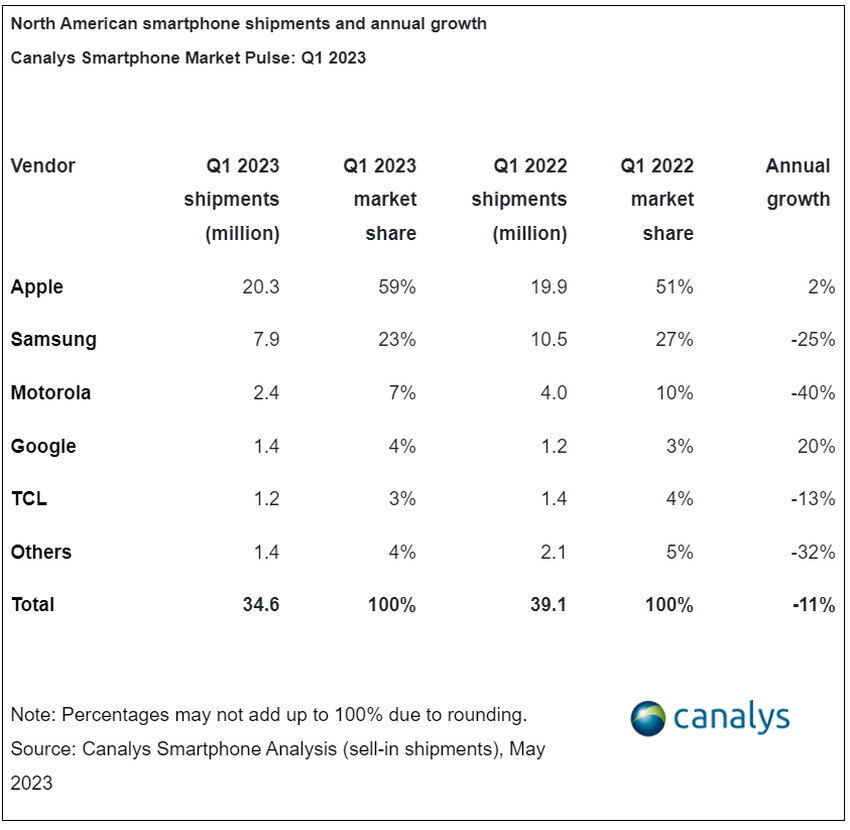 Z drugiej strony Google zdołało zwiększyć sprzedaż o 20% do 1,4 miliona. TCL również znalazło się w pierwszej piątce. Wszystkie pozostałe firmy dostarczyły łącznie 1,4 miliona smartfonów, o jedną trzecią mniej niż w okresie bazowym. Ich łączny udział wyniósł 4%, z czego Nokia i OnePlus stanowiły około połowę. Ogólnie rzecz biorąc, rynek północnoamerykański spadł o 11%. Dostawy spadły z 39,1 mln do 34,6 mln smartfonów.