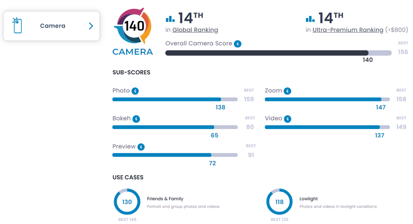 Liderem rankingu ze 156 punktami jest Huawei P60 Pro. Pierwsza piątka składała się wyłącznie z chińskich smartfonów. Google 7 Pro zajął 6. miejsce, a iPhone 14 Pro / Pro Max podzielił 8/9 miejsce. Pierwszym modelem Samsunga w rankingu jest wspomniany już flagowy Galaxy S23 Ultra.