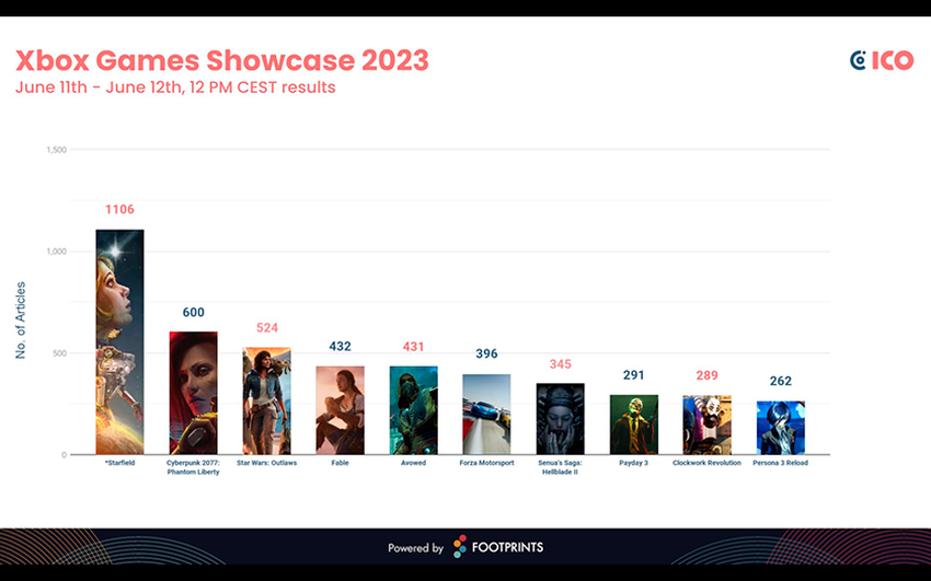 Przejdźmy teraz do statystyk pokazujących, które gry były najczęściej wymieniane w mediach. Najpierw przyjrzeliśmy się Xbox Games Showcase. Po raz kolejny najwięcej uwagi przyciągnął Starfield. O projekcie Bethesdy wspomniano co najmniej 1106 razy. Kolejne miejsce zajmuje Phantom Liberty, rozszerzenie do Cyberpunk 2077, o którym wspomniano 600 razy, a na trzecim miejscu znajduje się Star Wars Outlaws - o nowej grze w Odległej Galaktyce wspomniano 524 razy.