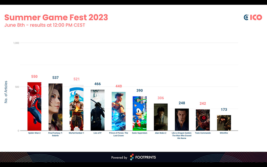 Przejdźmy teraz do Summer Game Fest. Tutaj liderem został Marvel's Spider-Man 2. Wspomniano o niej 550 razy. Kolejne miejsca zajęły Final Fantasy 7: Rebirth i Mortal Kombat 1 z odpowiednio 537 i 521 wzmiankami.