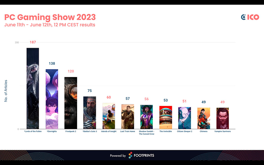 Ostatnią prezentacją w zestawieniu jest PC Gaming Show. Pokazano tu ponad 50 gier, ale liderami były Lords of The Fallen, Eternlights i Frostpunk 2. O każdej z nich wspominano średnio 150 razy.