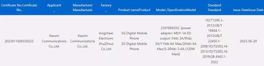 Gadżet ma numer modelu 23078RKD5C. Według dokumentów nowość będzie obsługiwać szybkie ładowanie z mocą 120 W za pośrednictwem zasilacza Xiaomi MDY-14-ED.