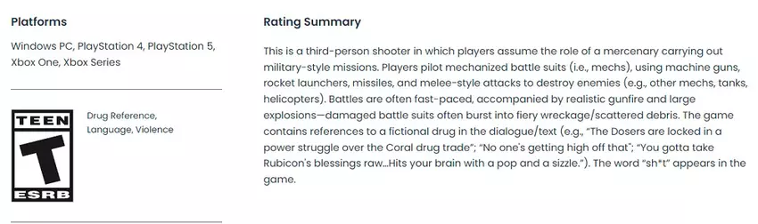 Eksperci ESRB nie znaleźli żadnych trudnych treści w Armored Core VI: Fires of Rubicon i przyznali grze ocenę T(13+).