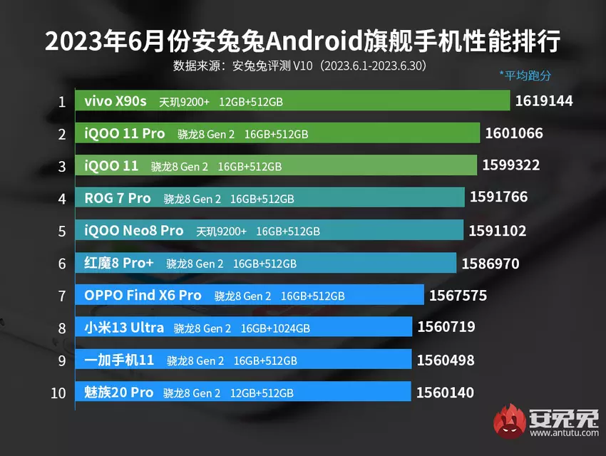 Pierwszą trójkę uzupełniły modele iQOO 11 Pro i iQOO 11, a do pierwszej piątki dołączył gamingowy smartfon ASUS ROG Phone 7 Pro. Drugą połowę rankingu otwiera nubia Red Magic 8 Pro+. Za nią uplasowały się OPPO Find X6 Pro, Xiaomi 13 Ultra, OnePlus 11 i Meizu 20 Pro.