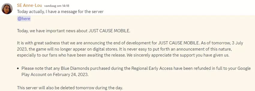 Deweloperzy nie podali przyczyny anulowania gry. Podziękowali graczom za zainteresowanie Just Cause Mobile i powiedzieli, że gra zostanie usunięta ze sklepów cyfrowych od 3 lipca.