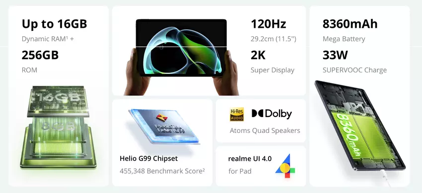 Realme Pad 2 jest wyposażony w procesor MediaTek Helio G99. Układ jest sparowany z 6/8 GB pamięci RAM LPDDR4X i 128/256 GB pamięci masowej. W razie potrzeby wbudowaną pamięć można rozszerzyć za pomocą karty microSD. Nowość posiada również cztery głośniki z Dolby Atmos, aparat główny 8 MP, taki sam aparat przedni, port USB typu C, gniazdo karty SIM i baterię 8,360 mAh z ładowaniem 33W. Tablet jest wyposażony w 4G LTE, Wi-Fi 802.11 ac (2,4 GHz + 5 GHz) i Bluetooth 5.3. Po wyjęciu z pudełka, nowy produkt działa pod kontrolą systemu operacyjnego Android 13 z realme UI 4.0 dla Pad.