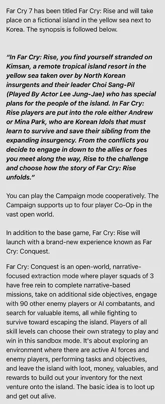 I tak, jako miejsce akcji Far Cry 7 wymienia się pewną wyspę Kimsan (Kimsan) niedaleko Korei, która zostaje opanowana przez rebeliantów dowodzonych przez brutalnego przywódcę z Korei Północnej (North Korea) Choi Sang-Pil (Choi Sang-Pil). Wiadomo już nawet, że rolę przywódcy bojowników zagra gwiazda serialu "Squid Game" (Kałamarnica) Lee Jung Jae (Lee Jung Jae).