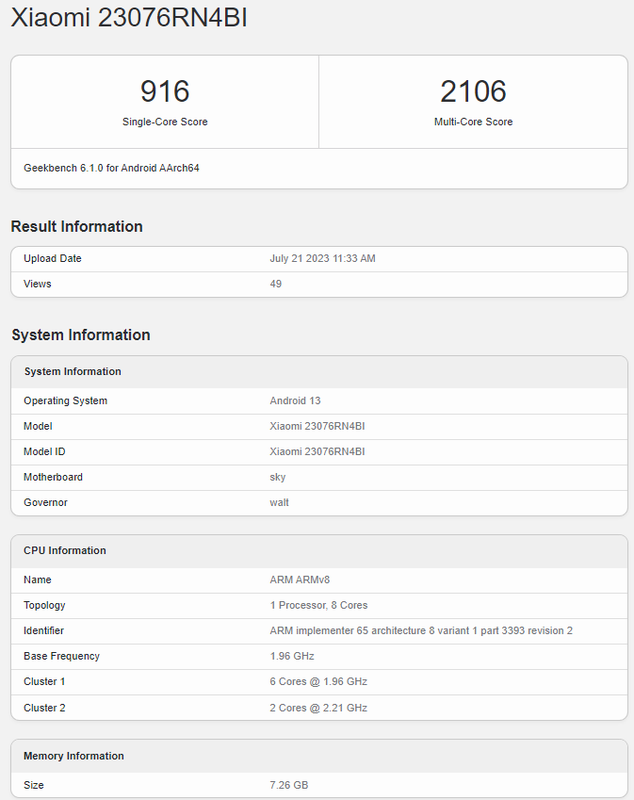Według informacji i bazy danych benchmarków, smartfon otrzyma procesor mobilny Snapdragon 4 Gen 2. Test wydajności przeszła wersja z 8 GB pamięci RAM, na której działa system operacyjny Android 13.