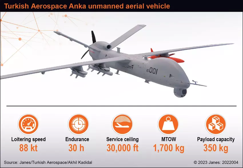 TAI Anka to turecki dron zwiadowczy dalekiego zasięgu. Jego maksymalna masa startowa wynosi 1700 kg i może przenosić do 350 kg ładunku. Układ napędowy jest reprezentowany przez silnik TEI-PD170 o mocy 170 koni mechanicznych.