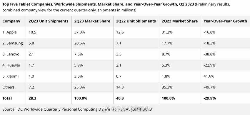 Apple nadal jest liderem na rynku tabletów, mimo że w drugim kwartale 2023 r. w porównaniu z tym samym okresem w 2022 r. dostawy spadły o 16,8%. Firma z Cupertino przejęła 37% rynku, sprzedając 10,5 miliona urządzeń.