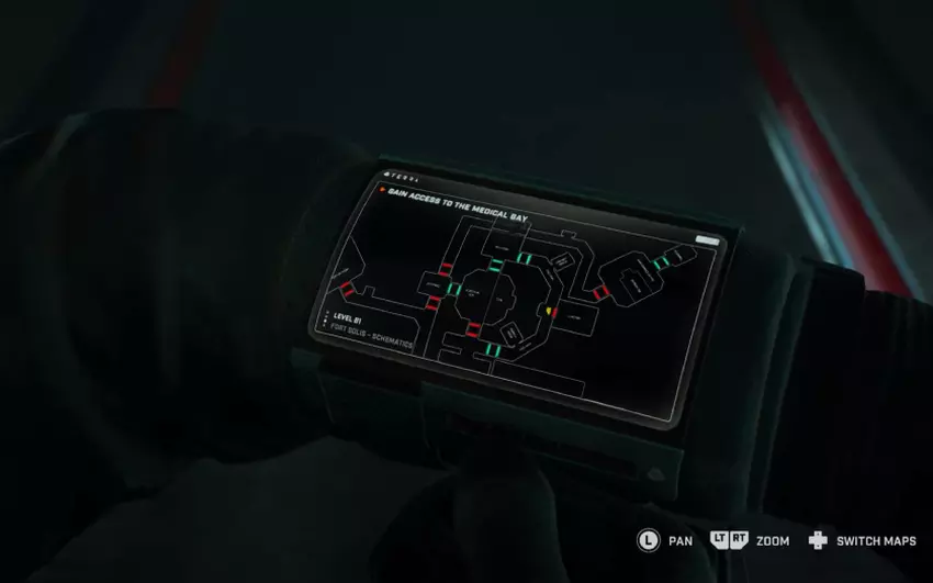 W grze jest tylko jeden poważny mankament - słabo zaimplementowana nawigacja po mapie. Wciskając R1 otrzymujemy mapę, która pokazuje wszystkie pomieszczenia i łączące je korytarze. Na tej mapie jest nawet żółty wskaźnik, który pokazuje naszą lokalizację, ale jest kilka niuansów. Żółty wskaźnik nie zawsze dokładnie pokazuje naszą lokalizację. Miałem sytuację, w której wskaźnik pokazywał, że jestem daleko od celu, przeszedłem kilka metrów i mój wskaźnik był tuż obok celu. Jak to działa? Być może ten błąd zostanie naprawiony po premierze, ale było to mylące. Mogło się też zdarzyć, że wskaźnik pokazywał mi, że idę jednym korytarzem, ale w rzeczywistości był to zupełnie inny korytarz, przez co znalazłem się w złym miejscu. Ponadto Fort Solis jest podzielony na kilka poziomów, a kiedy gra prosi cię o zejście korytarzem warunkowym A, może on znajdować się na trzecim poziomie, a ty jesteś na drugim poziomie, i tutaj byłoby miło, gdyby gra podpowiedziała, że powinieneś iść w dół lub w górę. Ponieważ mamy grę z minimalnym interfejsem, nie jest konieczne wytyczanie trasy, jak ma to miejsce w grach z otwartym światem. Chcę tylko, aby mapa była uczciwa i pokazywała mi dokładną lokalizację oraz wskazywała, którego poziomu stacji potrzebuję - to byłoby więcej niż wystarczające. Ogólnie rzecz biorąc, byłoby nawet fajnie, gdyby słaba nawigacja mapy była wyjaśniona faktem, że na Marsie znajduje się wrogi EW (wojna elektroniczna - przyp. red.).