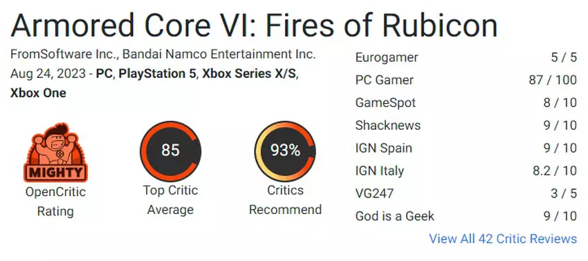 Ogólnie rzecz biorąc, większość krytyków chwali prawie wszystkie elementy Armored Core VI: Fires of Rubicon: gra ma świetną grafikę, doskonały system walki, ekscytującą rozgrywkę, ciekawą historię i świetną muzykę.