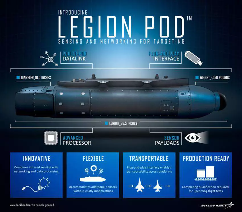 Legion Pod został zaprezentowany na początku 2015 roku. Lockheed Martin twierdzi, że nowy system IRST może jednocześnie śledzić wiele obiektów i zapewniać skuteczne celowanie, nawet przy użyciu zaawansowanych funkcji zagłuszania.