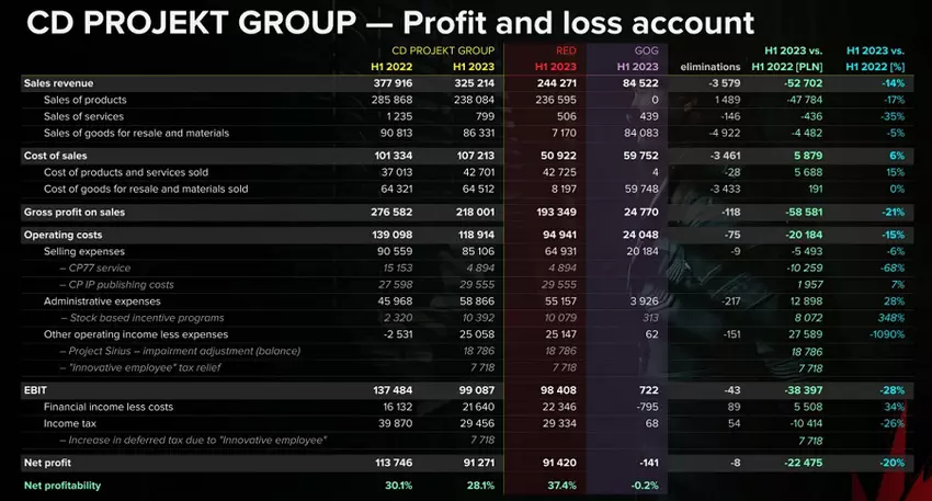 Zysk netto CD Projekt wyniósł 22 miliony dolarów, przy czym sprzedaż gier w pierwszej połowie 2023 roku spadła o 14 procent, a zysk operacyjny spadł o 28 procent.