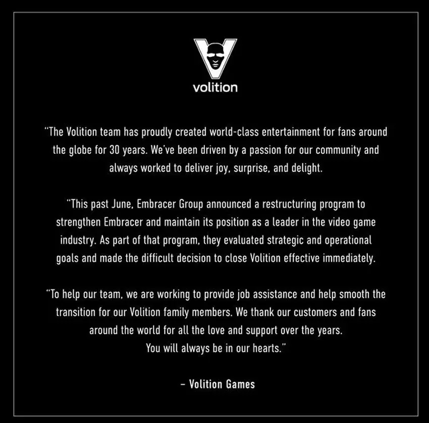 Kierownictwo Volition dziękuje fanom za lata wsparcia i miłości do ich gier oraz obiecuje pomóc pracownikom w znalezieniu nowej pracy.